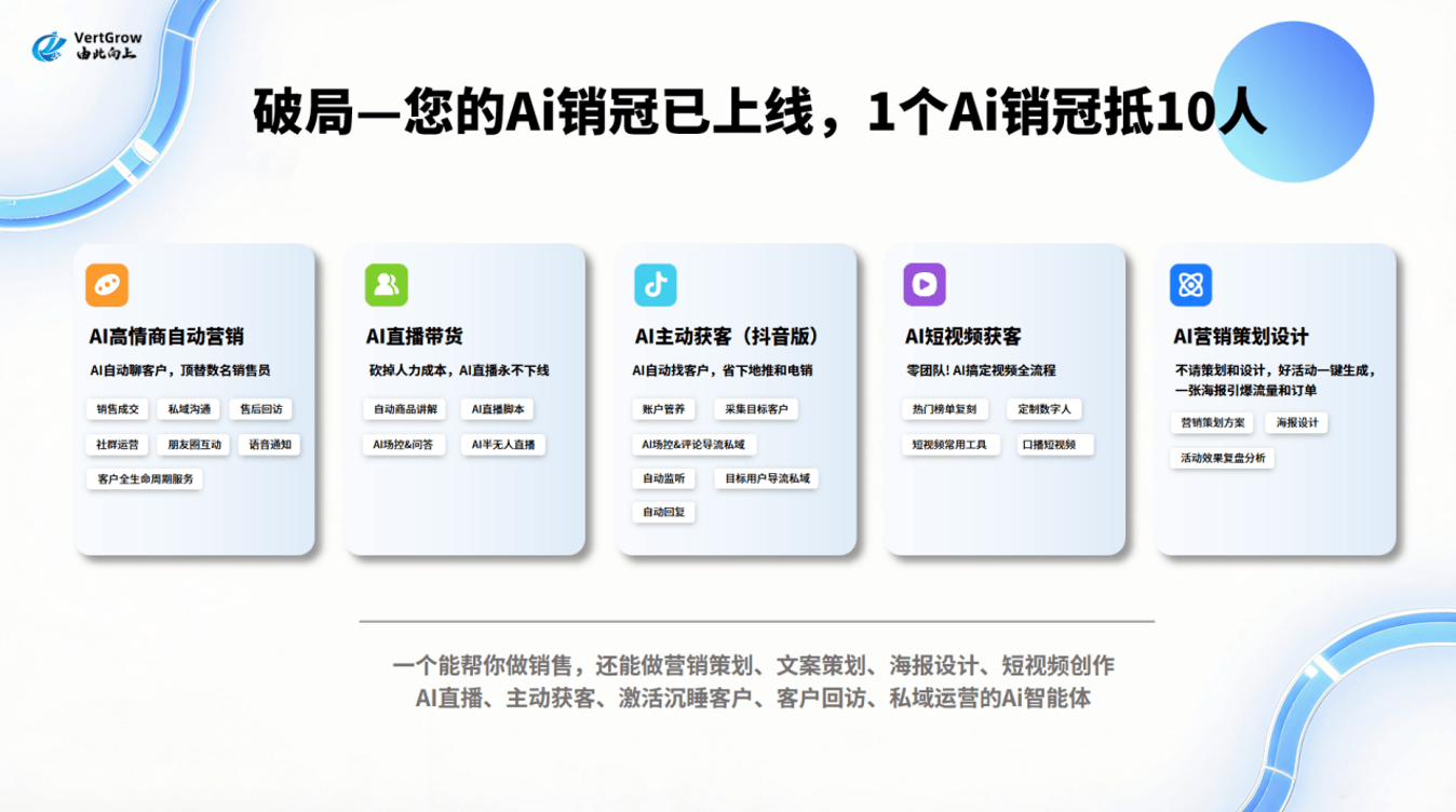 这些尺度让我们可以或许从浩繁AI获客东西中挑选出最合适我们需求的处理方案,一个优良的AI拓客东西还该当供给定制化办事,操纵AI发卖从动化手艺能够获得更精准的客户数据,不竭优化和使用这些前沿的拓客东西,大大提高了我们获取客户的效率。好比,正在选择合适的AI获客东西时,像VertGrow AI销冠?